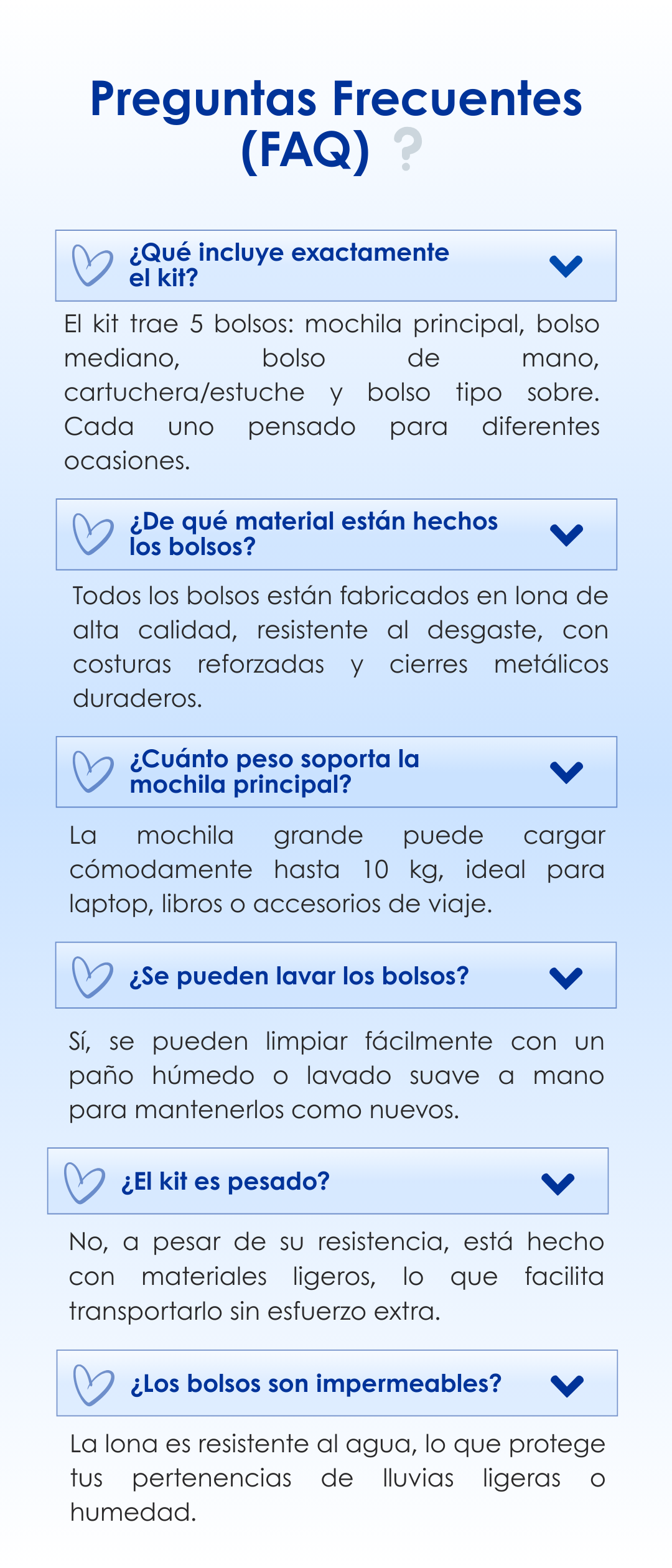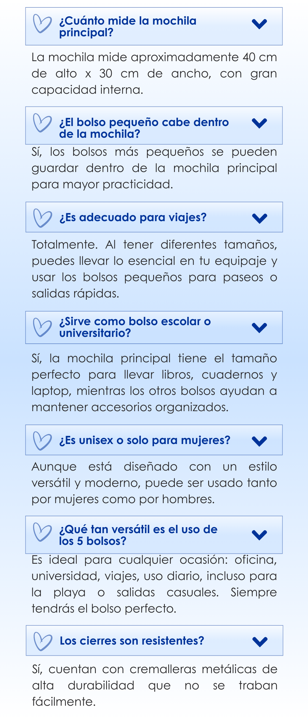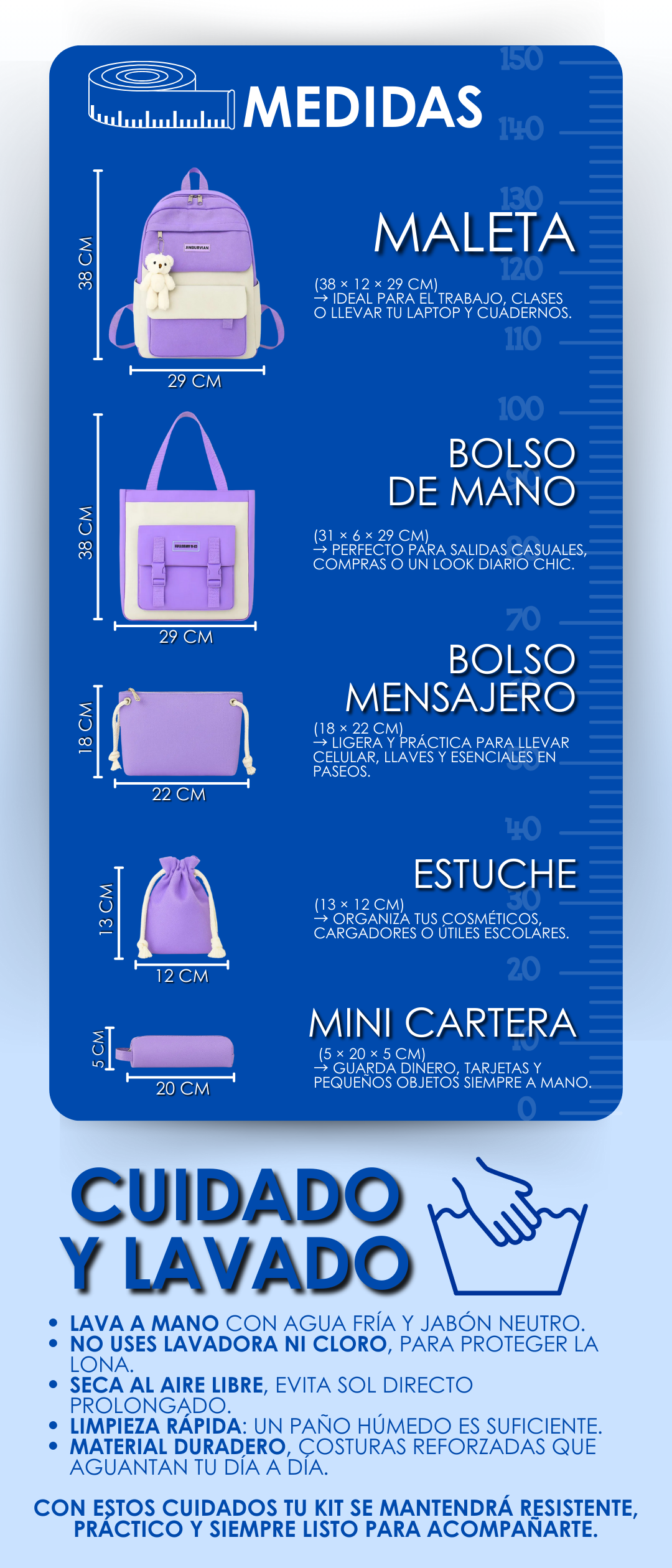 Con el Kit Mochila 5 en 1 tienes un bolso perfecto para cada ocasión: mochila, bolso de mano, lonchera, cartuchera y más. Todo organizado, ligero y sin esfuerzo.
